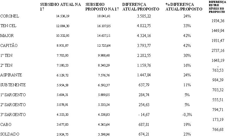 O oficial mostra, em quadro abaixo dentro desta postagem, o subsídio atual em cada patente e graduação dos quadros da PM e do Corpo de Bombeiros; mostra também para quanto vai o salário em cada patente e graduação; informa a diferença entre o salário atual e o futuro vencimento; o percentual de reajuste; e a diferença entre níveis de hierarquia proposto.