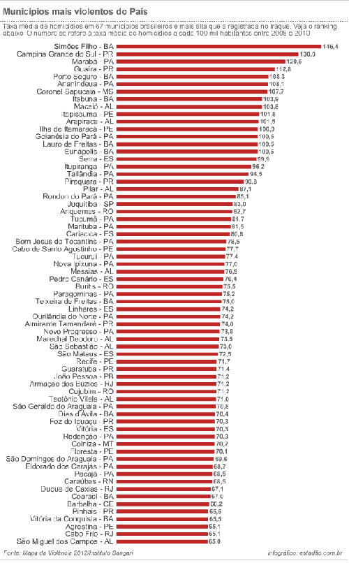 No Brasil, a cidade baiana de Simões Filho, na Região Metropolitana de Salvador, registrou taxa de 146,4 assassinatos por 100 mil habitantes, mais de duas vezes acima da insurgência iraquiana. Um terço dessas 67 cidades tem mais de 100 mil habitantes e só uma fica em São Paulo.
