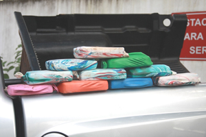 Sobre a cobertura da carroceria da caminhonete foram encontrados mais 10 tabletes da droga, perfazendo um total de 15,4 kg de cocaína base apreendidas.
