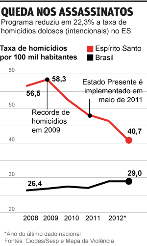 Apesar de ser um índice muito ruim, representa um avanço: é 19% menor do que o registrado em 2010, ano anterior à implementação do programa Estado Presente pelo governo do Espírito Santo, que em 2012 era o segundo Estado brasileiro com maior taxa de homicídios (47,3), de acordo com o último Mapa da Violência.