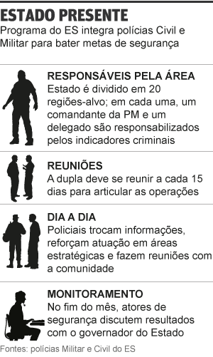 Ao final de cada mês, os responsáveis pelas 20 regiões integradas apresentam resultados em reunião com o governador do Estado, Renato Casagrande (PSB). Também participam do encontro secretários de governo, comandantes-gerais da PM e do Corpo de Bombeiros, o chefe da Polícia Civil e o procurador-geral do Estado. A proposta é promover discussões e possibilitar a articulação de ações entre todos os atores da segurança pública do Espírito Santo: da cúpula da polícia ao Poder Judiciário.