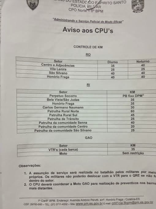 A CI foi fixada na sede da Companhia na sexta-feira passada (08/05). A 1ª Cia atende todo município de Cachoeiro (Sede, bairros e zona rural). Policiais (praças e oficiais) ouvidos pelo Blog do Elimar Côrtes informaram que, devido à ameaça de prisão e a redução da cota de combustíveis, as viaturas passaram a rodar bem menos. No interior de Cachoeiro, as guarnições somente saem dos Destacamentos Policiais Militares mediante “ocorrências graves”.