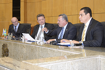 O presidente do Sindipol, Jorge Emílio Leal, e três dos diretores da entidade (Humberto Mileip Duarte Machado, Aloísio Duboc Fajardo e Joel Martins Pereira) acompanharam os trabalhos da Comissão de Segurança Pública nesta segunda-feira e ressaltaram a importância do Colegiado: