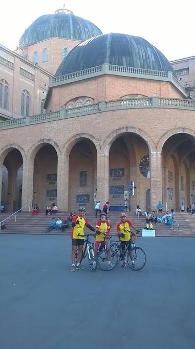 “Pedalamos seis dias, por 120 quilômetros por dia e dormimos em pousadas”, diz cabo Ricardo. Ele e os amigos Milton e Oripe são católicos e visitaram a Basílica de Aparecida.