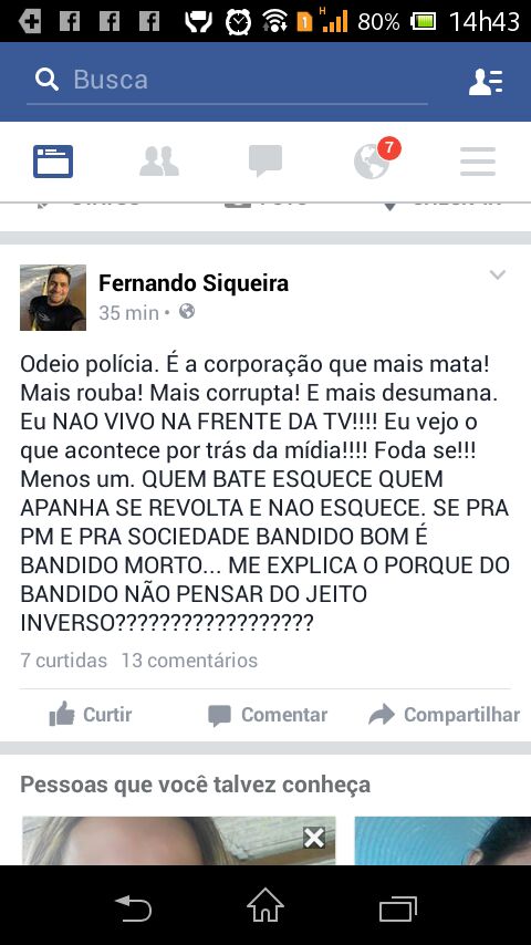 Já Fernando Siqueira foi mais além em sua página no Facebook. “Menos um”, disse ele ao se referir a morte do soldado Ítalo. Fernando escreveu mais: “Odeio polícia. É a corporação que mais mata. Mais rouba! Mais corrupta!” E acrescentou: “Se pra PM e pra sociedade bandido bom é bandido morto…Me explica o porque do bandido não pensar do jeito inverso???????”