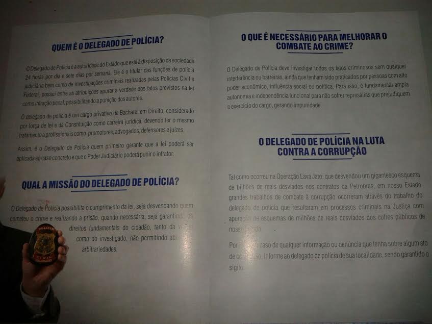 A cartilha apresenta um perfil simples, didático, compacto e explicativo em vários tópicos, indicando didaticamente o que faz o Delegado de Polícia; qual a sua missão; sua importância no enfrentamento à criminalidade; seu papel fundamental no combate à corrupção, sobretudo incentivando o cidadão a denunciar casos de desvios e ilegalidades nos órgãos públicos, sendo assegurado o sigilo.
