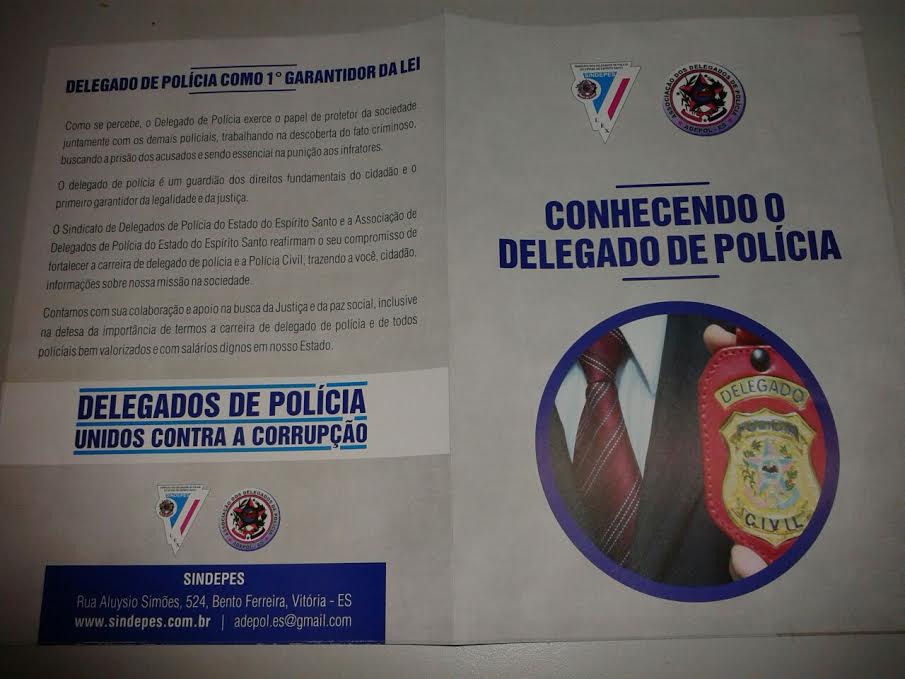 O Sindicato dos Delegados de Polícia do Estado do Espírito Santo (Sindepes) e a Associação dos Delegados de Polícia (Adepol/ES) prepararam e lançaram uma cartilha a ser difundida em toda sociedade civil intitulada “Conhecendo o Delegado de Polícia”, com 10 mil exemplares.