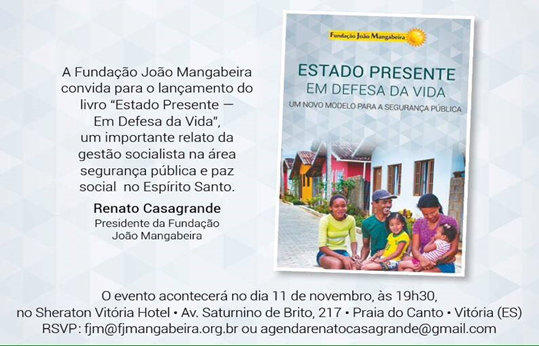 A Fundação João Mangabeira está lançando o livro ‘Estado Presente – Em Defesa da Vida – Um Novo Modelo para a Segurança Pública’, que relata a trajetória daquele que foi, efetivamente, o mais amplo programa de segurança pública implantado no Espírito Santo. O lançamento da obra será nesta quarta-feira (11/11), a partir das 19h30, no Hotel Sheraton, localizado na avenida Saturnino de Brito, 217, Praia do Canto, Vitória (próximo ao Mc Donald’s). O livro foi escrito pelo ex-governador Renato Casagrande (PSB), o delegado de Polícia Federal Álvaro Rogério Duboc Fajardo e o jornalista mineiro Paulinho Assunção.