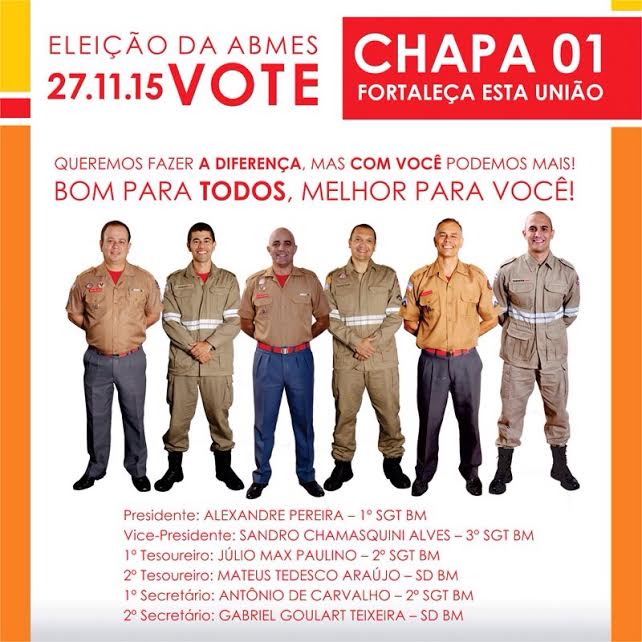 Com o nome de ‘Fortaleça Esta União’, a chapa 01 usou da criatividade para apresentar suas propostas por meio de folder. Pegou o lema do Corpo de Bombeiros para estabelecer suas primeiras quatro metas: RESGATE da credibilidade da entidade junto ao Governo e Comando; BUSCA de confiança dos Bombeiros Militares na entidade; SALVAMENTO das contas da Associação; e SOCORRO aos associados quando necessário.