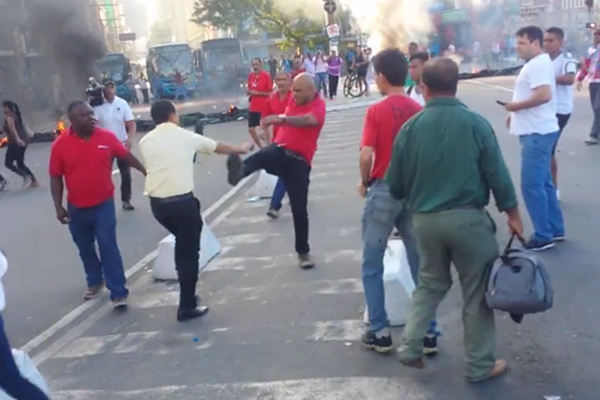 A maioria dos cerca de 80 manifestantes, todos ligados à Central Única dos Trabalhadores, ao PT e a outros sindicatos que defendem Dilma, foi para o Centro praticar atos de vandalismo e agressões. Tanto que eles colocaram fogo em pneus nas avenidas Getúlio Vargas e Jerônimo Monteiro, impedindo a circulação de veículos – ônibus e carros de passeio. Também agrediram fisicamente três jornalistas.