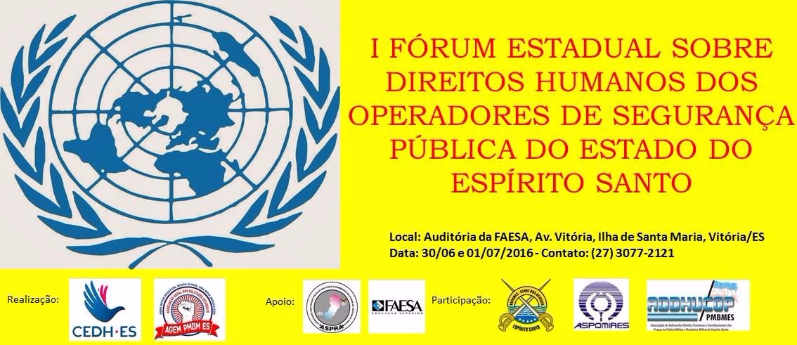 Numa iniciativa inédita no Brasil, o Conselho Estadual de Direitos Humanos do Espírito Santo e a Associação Geral dos Militares do Estado do Espírito Santo (AGEM/PM/BM) realizarão o I Fórum Estadual Sobre Direitos Humanos dos Operadores de Segurança Pública. O evento vai acontecer nos dias 30 de junho e 1º de julho deste ano, no Auditório da Faesa, na avenida Vitória, Ilha de Santa Maria.