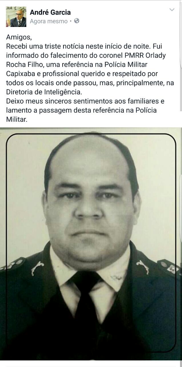 “Recebi uma triste notícia neste início de noite. Fui informado do falecimento do coronel PMRR Orlady Rocha Filho, uma referência na Polícia Militar Capixaba e profissional querido e respeitado por todos os locais onde passou, mas, principalmente, na Diretoria de Inteligência.