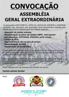 As Associações AGEM/PM/BMES, ASPRA/ES, ADDHUCOP, ASPOBOM e ASSEMPRIME vão realizar na quarta-feira (31/08) uma Assembleia Geral Extraordinária Unificada para apresentar aos policiais e bombeiros militares do Estado do Espírito Santo a pauta de reivindicações que está sendo levado ao governo do Estadual. O ato acontece a partir das 12h30, na Assembleia Legislativa, na Enseada do Suá, em Vitória. As entidades vão disponibilizar 20 ônibus para os militares que se deslocarem do interior. A assembléia geral é aberta a todos os militares estaduais – oficiais e praças –, independentes de serem ou não filiados às entidades acima.
