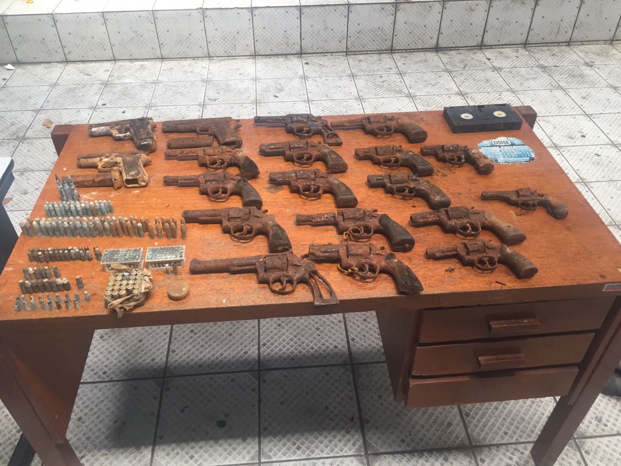 As armas aprendidas encontram-se bastante enferrujadas. Na avaliação da PM, elas ficaram muito tempo dentro dos cofres e foram molhadas ou enterradas.
