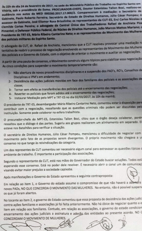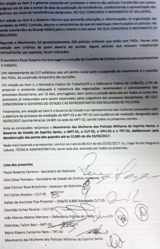 No dia 10 de fevereiro de 2017, uma semana após o início da maior crise na segurança pública do Espírito Santo, provocada pelo bloqueio dos batalhões da Polícia Militar por parte dos familiares de policiais militares e o aquartelamento de praças e parte dos oficiais – por melhores salários e condições de trabalho –, o governo do Estado se reuniu com os presidentes das Associações de Classe da PM e do Corpo de Bombeiros para fechar um acordo.