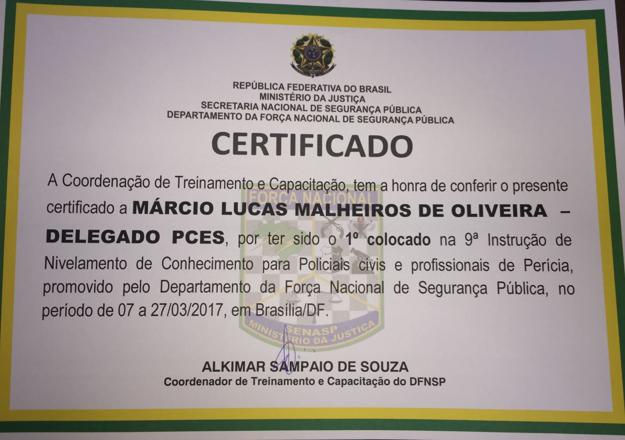 Ele fez questão de frisar que chegou em primeiro lugar no curso junto com o agente de Polícia Cleudes, do GOT, mas ficou com o título de primeira colocação devido aos critérios de desempate. “Todo o grupo do Espírito Santo foi elogiado e teve  participação destacada no 9º Curso de Instrução de Nivelamento e Conhecimento da Força Nacional”, pontuou Márcio Lucas, que é delegado-adjunto da Delegacia de Tóxicos e Entorpecentes da Polícia Civil.