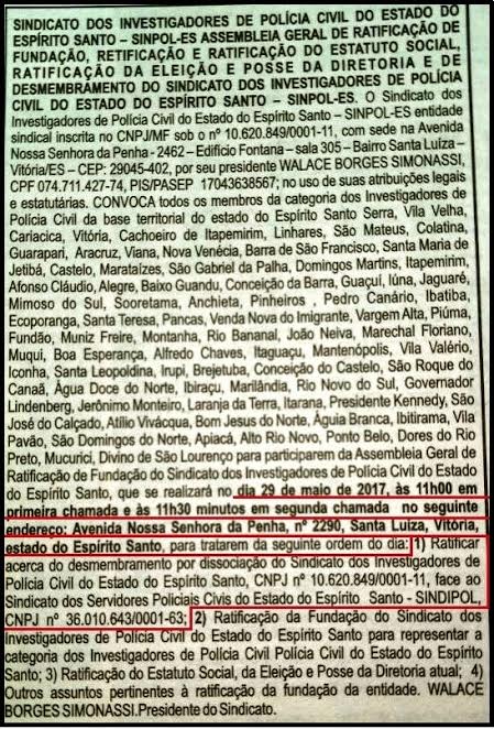 O presidente do Sindicato dos Investigadores de Polícia Civil do Estado do Espírito Santo (Sinpol) – que não é reconhecido pela Justiça do Trabalho –, Walace Borges Simonassi, convocou Assembleia Geral da categoria para  dia 29 de maio deste ano (uma segunda-feira), a partir das 11 horas, para “ratificar acerca do desmembramento por dissociação do Sinpol, face ao Sindicato dos Servidores Policiais Civis do Estado do Espírito Santo (Sindipol/ES).
