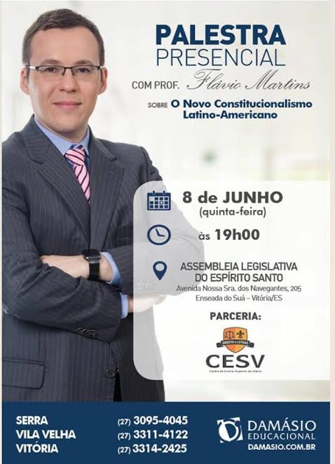 A Damásio Educacional, tradicional instituição na área do Direito, vai promover na quinta-feira (08/06), a partir das 19 horas, a palestra Novo Constitucionalismo Latino-Americano, a ser proferida pelo professor Flávio Martins. O evento acontecerá na Assembleia Legislativa do Estado do Espírito Santo, na Enseada do Suá, em Vitória.