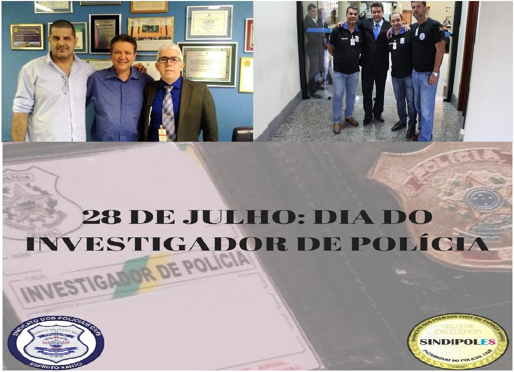 O Sindicato dos Servidores Policiais Civis do Estado do Espírito Santo está fazendo uma homenagem aos investigadores capixabas. É que nesta sexta-feira (28/07) é comemorado em todo o Estado do Espírito Santo o Dia do Investigador de Polícia. A data é celebrada desde o ano de 2008, quando os investigadores Francisco Lacerda Aguiar de Carvalho, Chiquinho, Aloísio Fajardo e Jânio Jacinto Araújo encaminharam ao deputado Euclério Sampaio um projeto de lei sugerindo a homenagem.