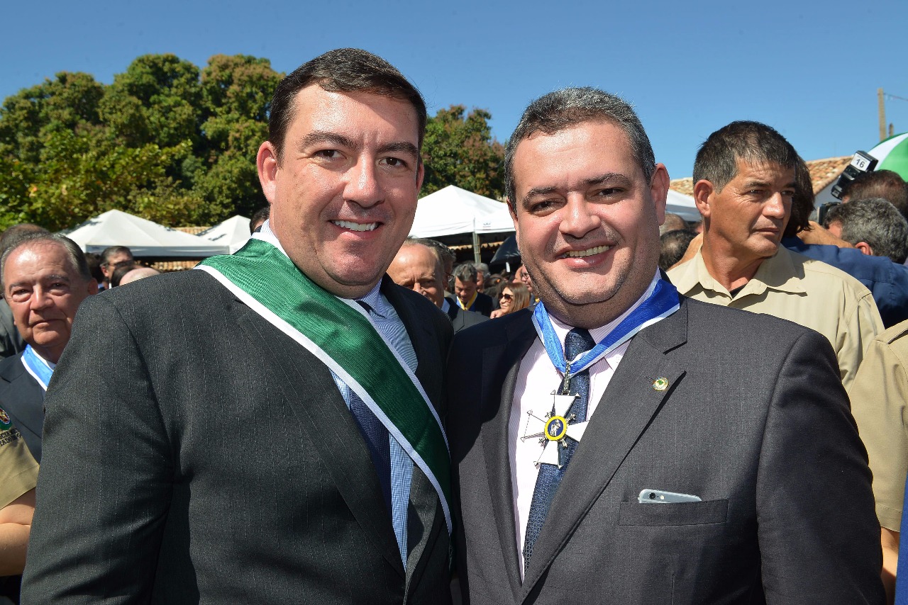 O deputado Sandro Locutor (à direita na foto) recebeu, na última terça-feira (25/07), a Comenda da Ordem do Mérito Anhanguera no Grau Grande Oficial do governo do Estado de Goiás. A homenagem foi proposta pelo governador Marconi Perillo (PSDB) e pelo presidente da Assembleia Legislativa de Goiás , José Vitti (PSDB). A Comenda da Ordem do Mérito Anhanguera é a mais alta condecoração concedida pelo Executivo daquele Estado a quem prestou relevantes serviços em todas as áreas e correntes políticas.
