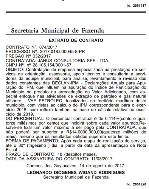 Vai embolsar uma bolada de R$ 14 milhões, de acordo com o Contrato número 074/2017. Na segunda-feira passada (14/08), o secretário Municipal da Fazenda de Campos de Goytacazes, Leonardo Diógenes Wigang Rodrigues, assinou o Extrato de Contrato, que em seguida foi publicado, anunciando a vitória da empresa capixaba.