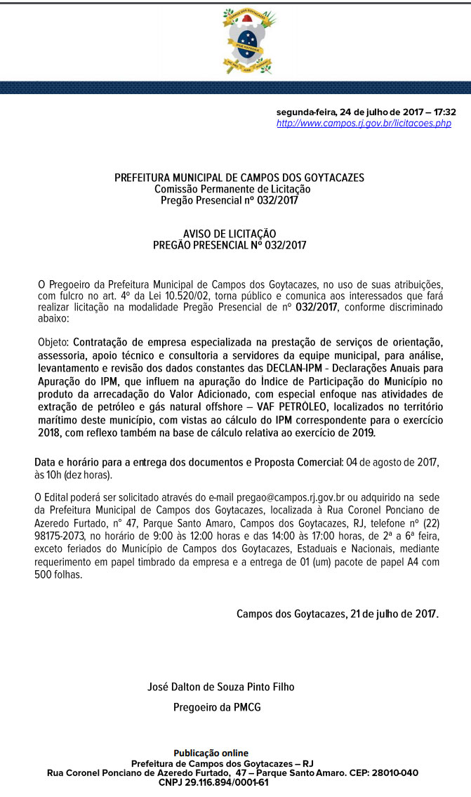 No dia 21 de julho de julho, a Prefeitura de Campos de Goytacazes, município localizado no Norte do Estado do Rio de Janeiro e que faz divisa com o Espírito Santo, assinou edital que foi publicado no dia 24 do mês com Aviso de Licitação do Pregão Presencial 032/2017.
