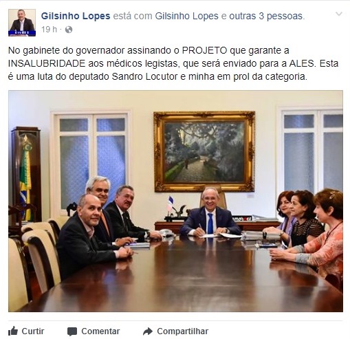 No entanto, para surpresa geral, o Sindipol tomou conhecimento, por meio das redes sociais, que o presidente atual da Comissão de Segurança da Ales, deputado Gilsinho Lopes – que é, inclusive, delegado de Polícia licenciado –, se reuniu com o governador Paulo Hartung com quem teria solicitado a elaboração de um Projeto de Lei que contemplasse com o adicional do pagamento de insalubridade somente os médicos-legistas:
