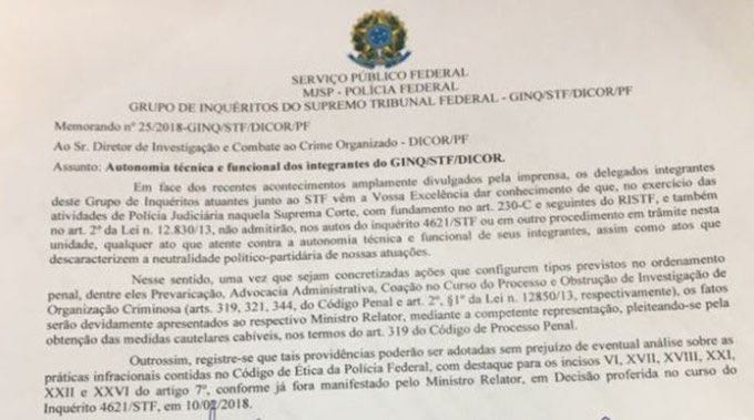 “Em face dos recentes acontecimentos amplamente divulgados pela imprensa, os delegados integrantes deste Grupo de Inquéritos junto ao STF vêm a Vossa Execelência dar conhecimento de que, no exercício das atividades de Polícia Judiciária naquela Suprema Corte, com fundamento no artigo 230-C do regimento interno do STF, e também no artigo 2 da lei 12.830, não admitirão, nos autos do inquérito 4621 ou em outro procedimento em trâmite nesta unidade, qualquer ato que atente contra a autonomia técnica e funcional de seus integrantes, assim como atos que descaracterizam a neutralidade político-partidária de nossas atuações.