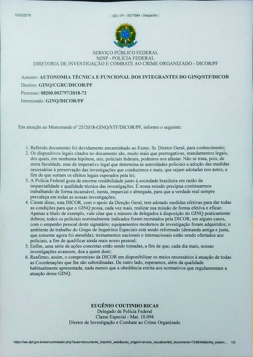 O diretor de Investigação e Combate ao Crime Organizado da Polícia Federal (Dicor), delegado Eugênio Coutinho Ricas, acaba de divulgar resposta ao teor do Memorando nº 25/2018, enviado a ele pelos delegados que integram o Grupo de Inquéritos Especiais da PF junto ao Supremo Tribunal Federal (GINQ/STF). Em primeira mão, o Blog do Elimar Côrtes informa a íntegra da resposta, em que Eugênio Ricas garante que “uma série de ações concretas estão sendo tomadas, a fim de que, cada dia mais, nossas investigações avancem, doa quem doer”. E finaliza o documento dizendo que, “esperamos, além da qualidade habitualmente apresentada, nada menos que a obediência estrita aos normativos que regulamentam a atuação desse GINQ”.