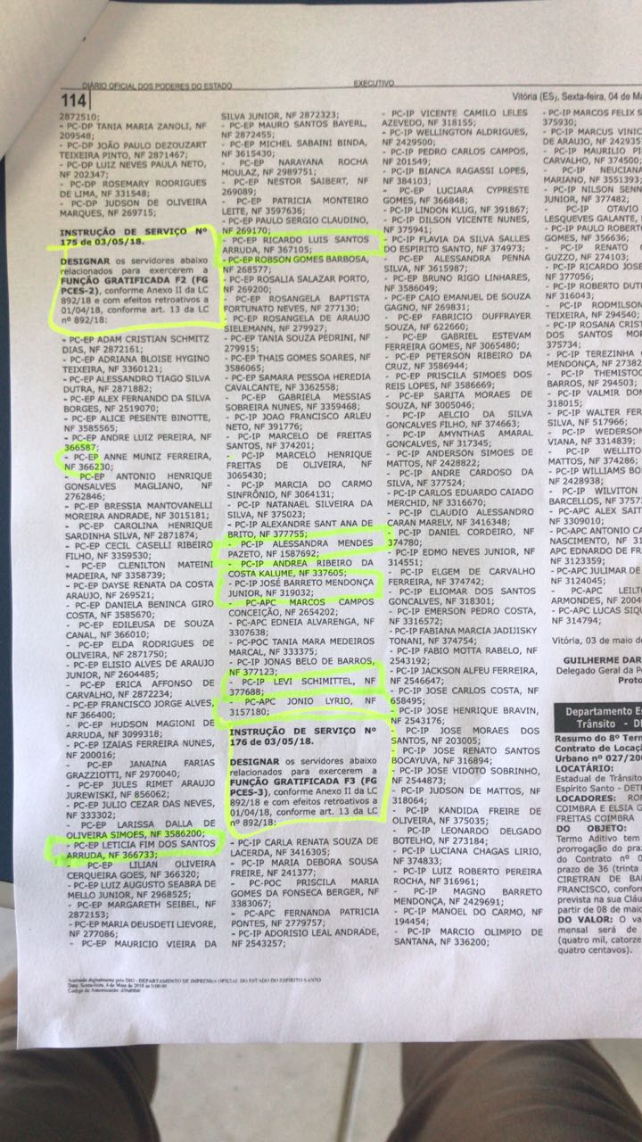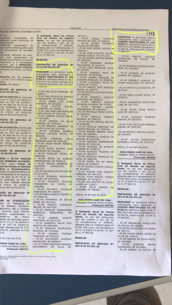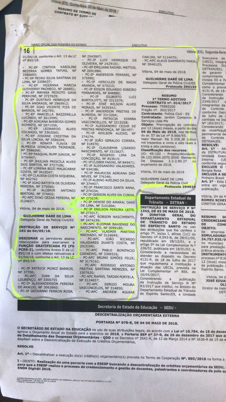 Todos os atos (Instruções de Serviços) são assinados pelo Delegado Geral da Polícia Civil, Guilherme Daré de Lima – antes, o nome do cargo era Chefe de Polícia e foi alterado com a lei. A situação é tão atípica que Guilherme Daré assinou gratificação para sua própria esposa, Denise do Amaral Daré de Lima, que é investigadora de Polícia, publicada no Diário Oficial do Estado de segunda-feira (07/05), conforme Instrução de Serviço nº 182 de 4 de maio de 2018.