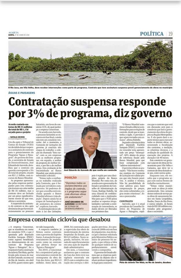 O deputado estadual Euclério Sampaio, responsável pela representação formulada junto ao Tribunal de Contas do Estado do Espírito Santo que culminou na suspensão da licitação do Programa Águas e Paisagens, rebateu na manhã desta quinta-feira (07/06) entrevista dada pelo secretário de Estado de Desenvolvimento, José Eduardo de Azevedo, ao jornal A Gazeta. Na entrevista, José Eduardo minimiza os efeitos da decisão do Tribunal de Contas, afirmando que “a licitação suspensa representa apenas 3% do total do projeto orçado em R$ 1,1 bilhão”.