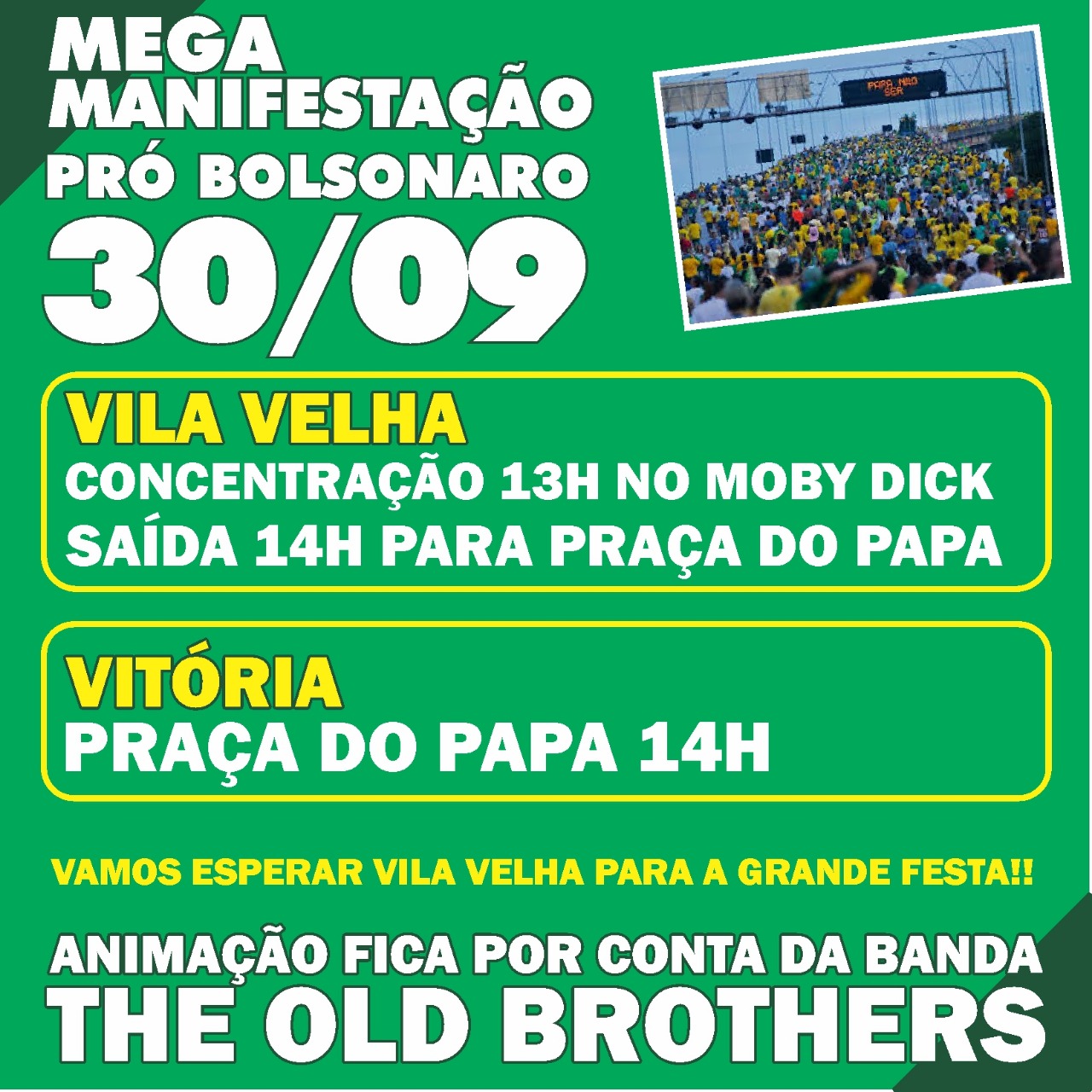 Em Vitória também haverá passeata, no domingo, em favor de Bolsonaro. A concentração começará às 13 horas, no Posto Moby Dick, na Praia da Costa, em Vila Velha. Em seguida, a multidão sai, pela Terceira Ponte, em direção à Praça do Papa, em Vitória. Espera-se a presença de mais de 100 mil pessoas. A passeata na capital capixaba está sendo organizado pelo Movimento Fora Dilma, criado na época em que o Congresso Nacional julgou e aprovou o impeachment da presidente Dilma Roussef (PT).