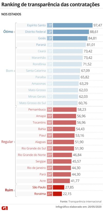 Com 97,47 pontos, o Espírito Santo é o mais transparente na divulgação dos contratos emergenciais feitos pelos Estados brasileiros durante a pandemia do novo coranavírus (Covid-19). É o que revela um novo ranking divulgado nesta quinta-feira (21/05) pela Transparência Internacional.