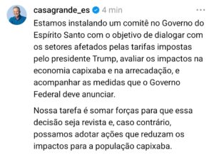 “Vamos criar esse comitê para analisar todas as decisões e medidas adotadas pelo Governo Federal em resposta às tarifas impostas pelo governo norte-americano. Será importante também para a gente conversar com os setores afetados com o objetivo de proteger as suas atividades no Espírito Santo, bem como dos empregos gerados e a ação dos empreendedores. Vamos analisar os efeitos das tarifas, caso sejam mantidas, sobre a receita do Estado e municípios, bem como da necessidade da adoção de alguma medida para conter despesas”, explicou Casagrande.