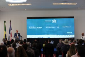 Casagrande e Marcelo Santos falaram para uma plateia formada por agricultores, pequenos produtores rurais e dirigentes de bancos e outras instituições financeiras, que compareceram ao Palácio Anchieta, em Vitória, para acompanhar o lançamento do Novo Plano de Crédito Rural 2025/26 para o Espírito Santo, acompanhado da apresentação da Plataforma Selo Verde-ES e da assinatura do Projeto de Lei que autoriza o uso de crédito outorgado de ICMS para instalação de redes trifásicas no meio rural.
