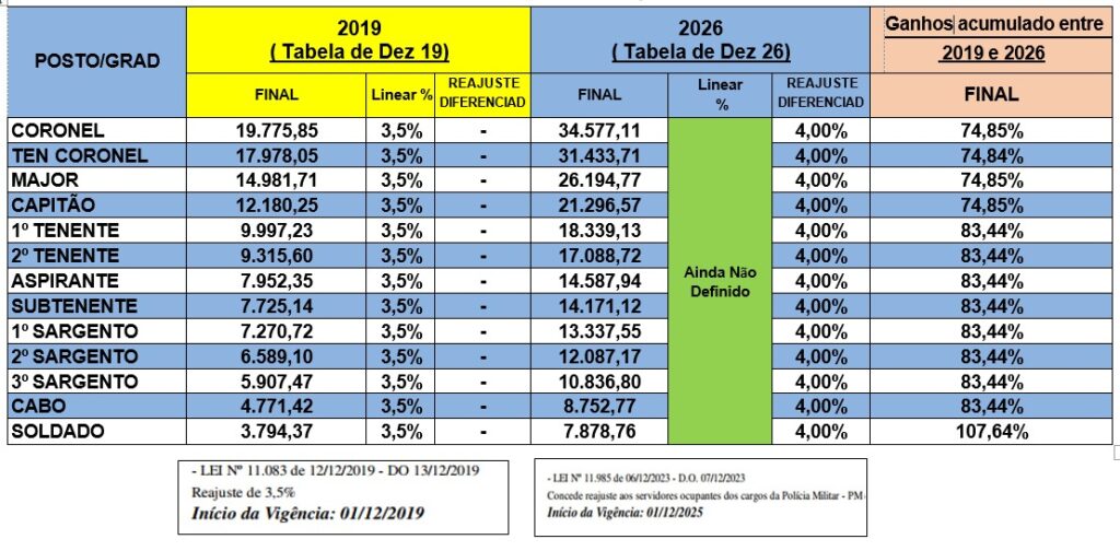 Salário na PM e no Corpo de Bombeiros (2019/2026):