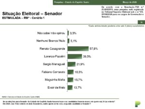 No primeiro cenário, Casagrande, que vai deixar o comando do Executivo Estadual no dia 2 de abril para disputar o Senado – ele será substituído pelo vice-governador Ricardo Ferraço –, tem 57,8% das intenções de votos. Atrás vêm o prefeito de Vitória, Lorenzo Pazolini (Republicanos), com 39,5%; o deputado estadual Sérgio Meneguelli (PSD) com 21,9%; o senador Fabiano Contarato (PT), que soma 16,5%; a filha do senador Mago Malta, Maguinha Malta (PL), com 15,7%; e o deputado federal Evair de Melo (PP), com 13,7%
