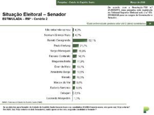 Num segundo cenário – também no levantamento estimulado –, a Paraná Pesquisas indica 12 nomes para os entrevistados e, mais uma vez, o governador Casagrande aparece na primeira colocação com índice de 52,1%. Muito atrás surge o ex-governador Paulo Hartung (PSD) com 21,7%. O deputado Meneguelli de novo está na frente de Fabiano Contarato: Meneguelli soma 16,9%, contra 14,5% do senador petista.